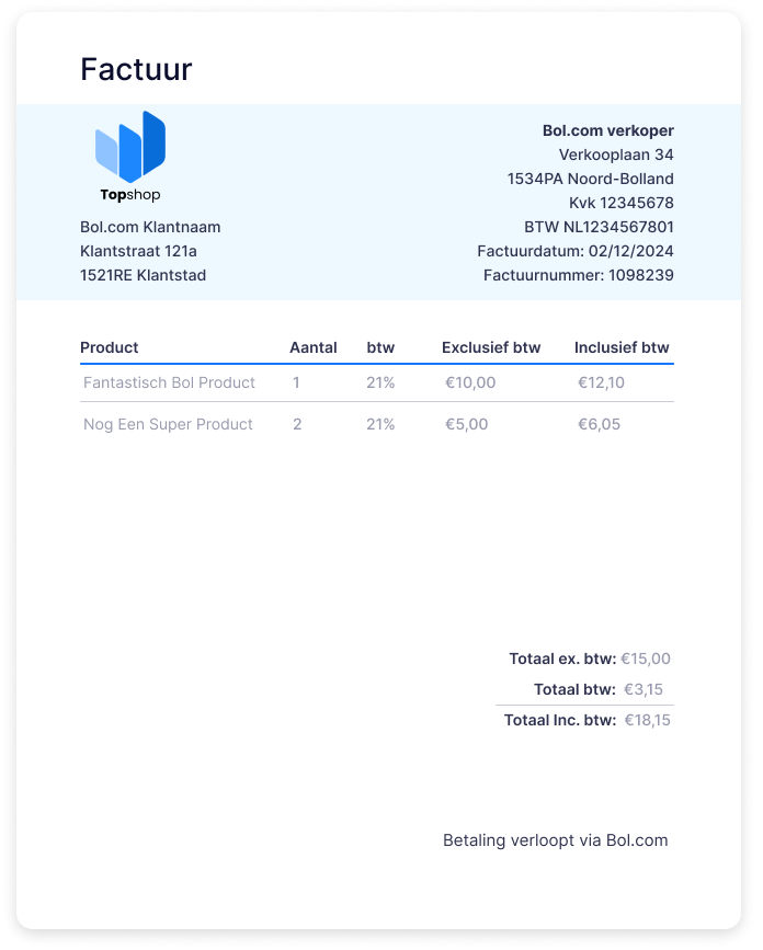 Bol.com biedt zelf een super basic een factuur template die je kunt gebruiken. Maar hoewel dit een handige start is, komt er vaak nog een hoop handmatig werk bij kijken. Vooral als je rekening houdt met de eisen voor je BTW-aangifte en de vragen die klanten soms hebben over ontbrekende of incorrecte facturen. Gelukkig is er een oplossing: Buddli.