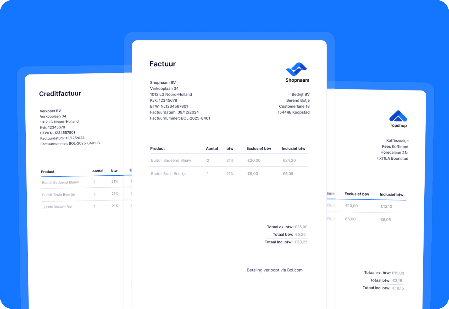 Met Buddli automatiseer je het volledige factuurproces. Zodra een bestelling binnenkomt, genereert Buddli automatisch een correcte btw-factuur op basis van de klant- en bestelgegevens. De factuur wordt direct naar de klant gestuurd, waardoor er geen openstaande bol factuuraanvragen meer ontstaan.