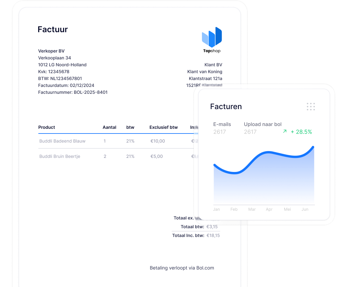 Buddli maakt en verstuurt btw-facturen automatisch via bol. Na de bestelling wordt er direct een factuur gemaakt en geüpload naar het klantaccount op bol, waar de klant deze zelf kan downloaden. Zo voorkom je klantvragen!
