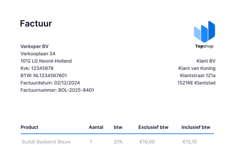 Sellerly biedt de functionaliteit om facturen direct te uploaden in de klantomgeving. Wanneer een klant een bestelling plaatst, wordt automatisch de factuur gemaakt en de PDF hiervan in het klantportaal in Bol geplaatst. Dit voorkomt klantvragen. Bij Buddli bieden we deze functionaliteit ook aan.